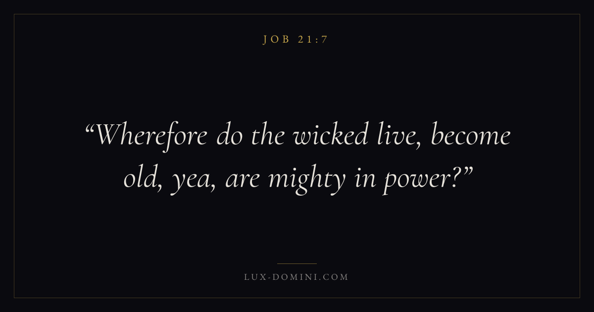 Books / Job / Chapter 21 / Verse 7 ← Job 21:6 Job 21:7 Job 21:8 → Wherefore do the wicked live, become old, yea, are mighty in power? Download verse card Share on Twitter Share on Facebook Pin it ✦ Key themes Suffering and trialsWisdomJustice and mercySuffering Read with Job 21:8Romans 8:182 Corinthians 4:17Proverbs 1:7 Related topics Bible verses about suffering and trialsBible verses about wisdomBible verses about justice and mercy ✦ Job Chapter 21 verses V. 1 V. 2 V. 3 V. 4 V. 5 V. 6 V. 7 V. 8 V. 9 V. 10 V. 11 V. 12 V. 13 V. 14 V. 15 V. 16 V. 17 V. 18 V. 19 V. 20 V. 21 V. 22 V. 23 V. 24 V. 25 V. 26 V. 27 V. 28 V. 29 V. 30 V. 31 V. 32 V. 33 V. 34