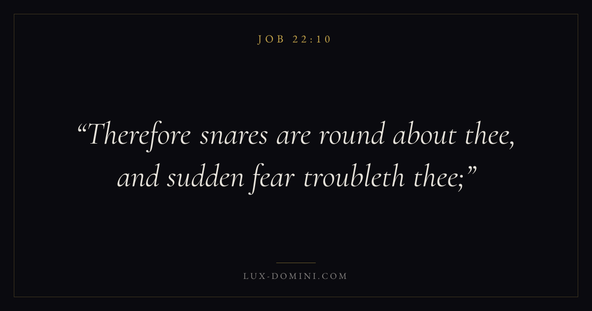 Books / Job / Chapter 22 / Verse 10 ← Job 22:9 Job 22:10 Job 22:11 → Therefore snares are round about thee, and sudden fear troubleth thee; Download verse card Share on Twitter Share on Facebook Pin it ✦ Key themes Anxiety and fearSuffering and trialsWisdomJustice and mercySuffering Read with Job 22:9Job 22:11Philippians 4:6Isaiah 41:10 Related topics Bible verses about anxiety and fearBible verses about suffering and trialsBible verses about wisdomBible verses about justice and mercy ✦ Job Chapter 22 verses V. 1 V. 2 V. 3 V. 4 V. 5 V. 6 V. 7 V. 8 V. 9 V. 10 V. 11 V. 12 V. 13 V. 14 V. 15 V. 16 V. 17 V. 18 V. 19 V. 20 V. 21 V. 22 V. 23 V. 24 V. 25 V. 26 V. 27 V. 28 V. 29 V. 30