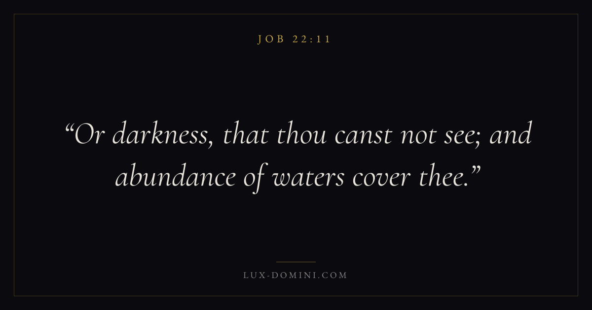 Books / Job / Chapter 22 / Verse 11 ← Job 22:10 Job 22:11 Job 22:12 → Or darkness, that thou canst not see; and abundance of waters cover thee. Download verse card Share on Twitter Share on Facebook Pin it ✦ Key themes Suffering and trialsWisdomJustice and mercySuffering Read with Job 22:9Job 22:10Romans 8:182 Corinthians 4:17 Related topics Bible verses about suffering and trialsBible verses about wisdomBible verses about justice and mercy ✦ Job Chapter 22 verses V. 1 V. 2 V. 3 V. 4 V. 5 V. 6 V. 7 V. 8 V. 9 V. 10 V. 11 V. 12 V. 13 V. 14 V. 15 V. 16 V. 17 V. 18 V. 19 V. 20 V. 21 V. 22 V. 23 V. 24 V. 25 V. 26 V. 27 V. 28 V. 29 V. 30