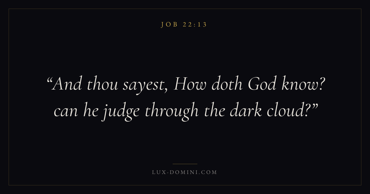 Books / Job / Chapter 22 / Verse 13 ← Job 22:12 Job 22:13 Job 22:14 → And thou sayest, How doth God know? can he judge through the dark cloud? Download verse card Share on Twitter Share on Facebook Pin it ✦ Key themes Suffering and trialsWisdomJustice and mercySuffering Read with Job 22:12Job 22:14Romans 8:182 Corinthians 4:17 Related topics Bible verses about suffering and trialsBible verses about wisdomBible verses about justice and mercy ✦ Job Chapter 22 verses V. 1 V. 2 V. 3 V. 4 V. 5 V. 6 V. 7 V. 8 V. 9 V. 10 V. 11 V. 12 V. 13 V. 14 V. 15 V. 16 V. 17 V. 18 V. 19 V. 20 V. 21 V. 22 V. 23 V. 24 V. 25 V. 26 V. 27 V. 28 V. 29 V. 30