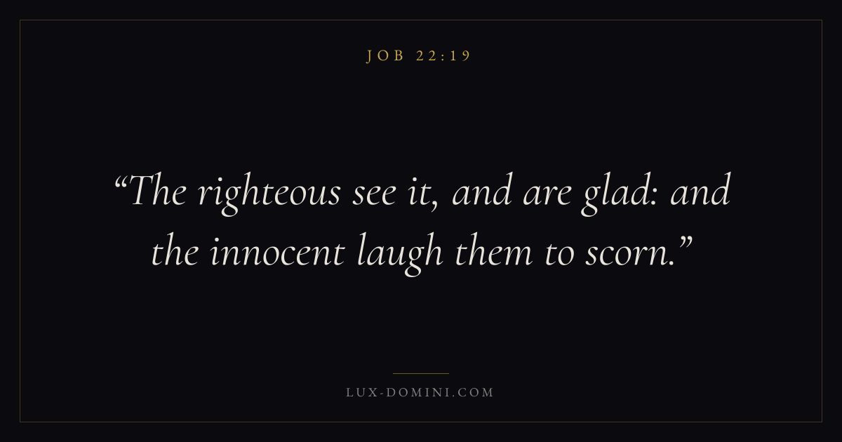 Books / Job / Chapter 22 / Verse 19 ← Job 22:18 Job 22:19 Job 22:20 → The righteous see it, and are glad: and the innocent laugh them to scorn. Download verse card Share on Twitter Share on Facebook Pin it ✦ Key themes Suffering and trialsWisdomJustice and mercySuffering Read with Job 22:20Romans 8:182 Corinthians 4:17Proverbs 1:7 Related topics Bible verses about suffering and trialsBible verses about wisdomBible verses about justice and mercy ✦ Job Chapter 22 verses V. 1 V. 2 V. 3 V. 4 V. 5 V. 6 V. 7 V. 8 V. 9 V. 10 V. 11 V. 12 V. 13 V. 14 V. 15 V. 16 V. 17 V. 18 V. 19 V. 20 V. 21 V. 22 V. 23 V. 24 V. 25 V. 26 V. 27 V. 28 V. 29 V. 30