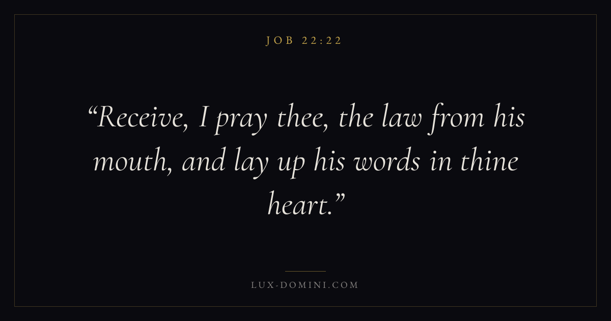 Books / Job / Chapter 22 / Verse 22 ← Job 22:21 Job 22:22 Job 22:23 → Receive, I pray thee, the law from his mouth, and lay up his words in thine heart. Download verse card Share on Twitter Share on Facebook Pin it ✦ Key themes Suffering and trialsPrayerWisdomJustice and mercySuffering Read with Job 22:21Romans 8:182 Corinthians 4:17Matthew 6:9 Related topics Bible verses about suffering and trialsBible verses about prayerBible verses about wisdomBible verses about justice and mercy ✦ Job Chapter 22 verses V. 1 V. 2 V. 3 V. 4 V. 5 V. 6 V. 7 V. 8 V. 9 V. 10 V. 11 V. 12 V. 13 V. 14 V. 15 V. 16 V. 17 V. 18 V. 19 V. 20 V. 21 V. 22 V. 23 V. 24 V. 25 V. 26 V. 27 V. 28 V. 29 V. 30