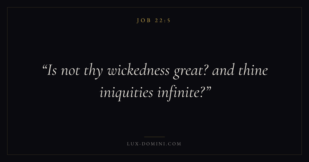 Books / Job / Chapter 22 / Verse 5 ← Job 22:4 Job 22:5 Job 22:6 → Is not thy wickedness great? and thine iniquities infinite? Download verse card Share on Twitter Share on Facebook Pin it ✦ Key themes Suffering and trialsWisdomJustice and mercySuffering Read with Job 22:6Romans 8:182 Corinthians 4:17Proverbs 1:7 Related topics Bible verses about suffering and trialsBible verses about wisdomBible verses about justice and mercy ✦ Job Chapter 22 verses V. 1 V. 2 V. 3 V. 4 V. 5 V. 6 V. 7 V. 8 V. 9 V. 10 V. 11 V. 12 V. 13 V. 14 V. 15 V. 16 V. 17 V. 18 V. 19 V. 20 V. 21 V. 22 V. 23 V. 24 V. 25 V. 26 V. 27 V. 28 V. 29 V. 30