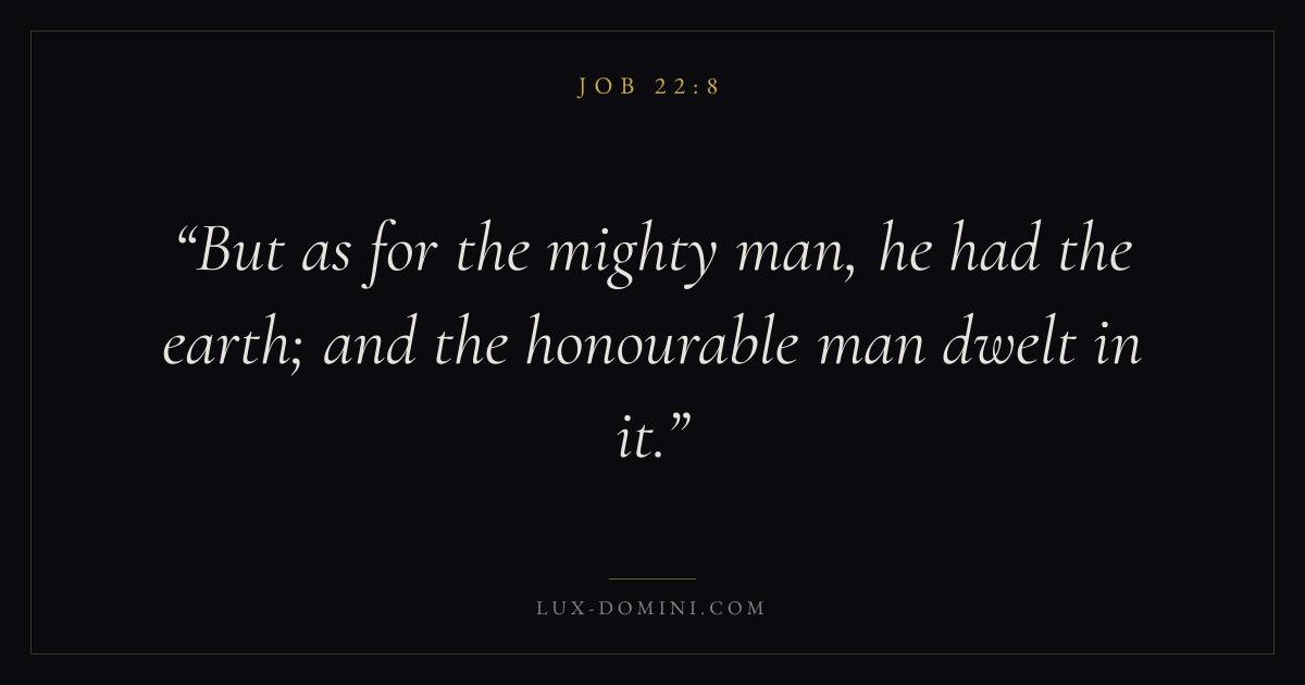 Books / Job / Chapter 22 / Verse 8 ← Job 22:7 Job 22:8 Job 22:9 → But as for the mighty man, he had the earth; and the honourable man dwelt in it. Download verse card Share on Twitter Share on Facebook Pin it ✦ Key themes Suffering and trialsWisdomJustice and mercySuffering Read with Job 22:7Romans 8:182 Corinthians 4:17Proverbs 1:7 Related topics Bible verses about suffering and trialsBible verses about wisdomBible verses about justice and mercy ✦ Job Chapter 22 verses V. 1 V. 2 V. 3 V. 4 V. 5 V. 6 V. 7 V. 8 V. 9 V. 10 V. 11 V. 12 V. 13 V. 14 V. 15 V. 16 V. 17 V. 18 V. 19 V. 20 V. 21 V. 22 V. 23 V. 24 V. 25 V. 26 V. 27 V. 28 V. 29 V. 30