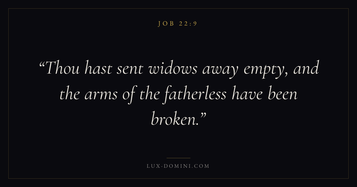 Books / Job / Chapter 22 / Verse 9 ← Job 22:8 Job 22:9 Job 22:10 → Thou hast sent widows away empty, and the arms of the fatherless have been broken. Download verse card Share on Twitter Share on Facebook Pin it ✦ Key themes Suffering and trialsWisdomJustice and mercySuffering Read with Job 22:10Job 22:11Romans 8:182 Corinthians 4:17 Related topics Bible verses about suffering and trialsBible verses about wisdomBible verses about justice and mercy ✦ Job Chapter 22 verses V. 1 V. 2 V. 3 V. 4 V. 5 V. 6 V. 7 V. 8 V. 9 V. 10 V. 11 V. 12 V. 13 V. 14 V. 15 V. 16 V. 17 V. 18 V. 19 V. 20 V. 21 V. 22 V. 23 V. 24 V. 25 V. 26 V. 27 V. 28 V. 29 V. 30