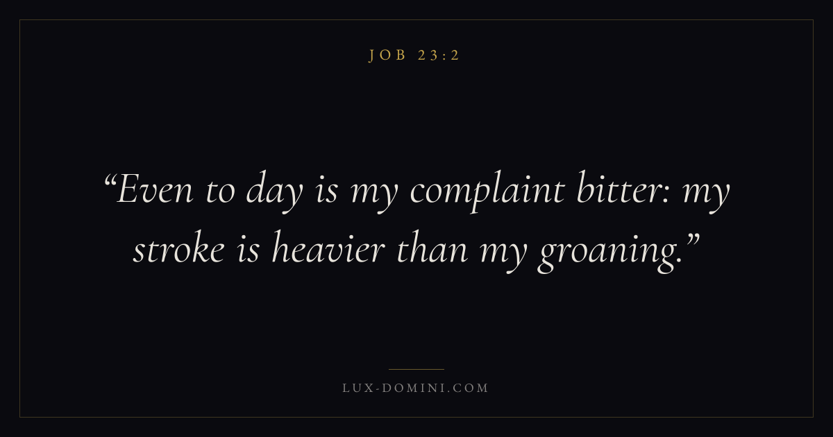 Books / Job / Chapter 23 / Verse 2 ← Job 23:1 Job 23:2 Job 23:3 → Even to day is my complaint bitter: my stroke is heavier than my groaning. Download verse card Share on Twitter Share on Facebook Pin it ✦ Key themes Suffering and trialsWisdomJustice and mercySuffering Read with Job 23:1Romans 8:182 Corinthians 4:17Proverbs 1:7 Related topics Bible verses about suffering and trialsBible verses about wisdomBible verses about justice and mercy ✦ Job Chapter 23 verses V. 1 V. 2 V. 3 V. 4 V. 5 V. 6 V. 7 V. 8 V. 9 V. 10 V. 11 V. 12 V. 13 V. 14 V. 15 V. 16 V. 17