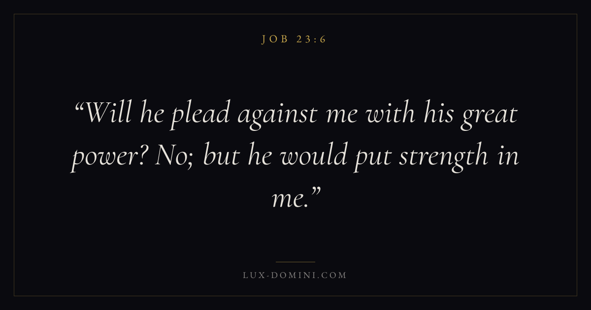 Books / Job / Chapter 23 / Verse 6 ← Job 23:5 Job 23:6 Job 23:7 → Will he plead against me with his great power? No; but he would put strength in me. Download verse card Share on Twitter Share on Facebook Pin it ✦ Key themes Suffering and trialsWisdomJustice and mercySuffering Read with Job 23:5Job 23:7Romans 8:182 Corinthians 4:17 Related topics Bible verses about suffering and trialsBible verses about wisdomBible verses about justice and mercy ✦ Job Chapter 23 verses V. 1 V. 2 V. 3 V. 4 V. 5 V. 6 V. 7 V. 8 V. 9 V. 10 V. 11 V. 12 V. 13 V. 14 V. 15 V. 16 V. 17