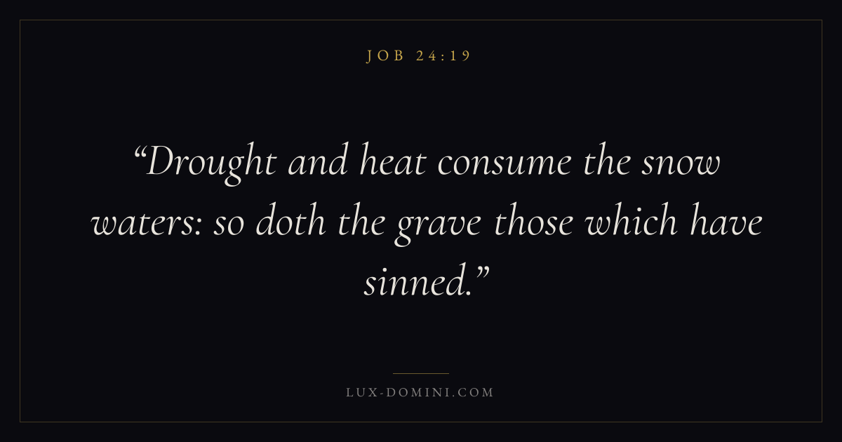 Books / Job / Chapter 24 / Verse 19 ← Job 24:18 Job 24:19 Job 24:20 → Drought and heat consume the snow waters: so doth the grave those which have sinned. Download verse card Share on Twitter Share on Facebook Pin it ✦ Key themes Suffering and trialsWisdomJustice and mercySuffering Read with Job 24:18Romans 8:182 Corinthians 4:17Proverbs 1:7 Related topics Bible verses about suffering and trialsBible verses about wisdomBible verses about justice and mercy ✦ Job Chapter 24 verses V. 1 V. 2 V. 3 V. 4 V. 5 V. 6 V. 7 V. 8 V. 9 V. 10 V. 11 V. 12 V. 13 V. 14 V. 15 V. 16 V. 17 V. 18 V. 19 V. 20 V. 21 V. 22 V. 23 V. 24 V. 25