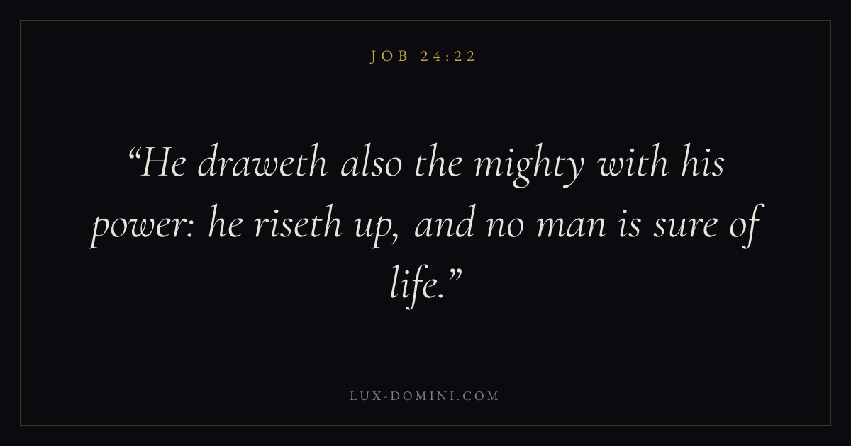 Books / Job / Chapter 24 / Verse 22 ← Job 24:21 Job 24:22 Job 24:23 → He draweth also the mighty with his power: he riseth up, and no man is sure of life. Download verse card Share on Twitter Share on Facebook Pin it ✦ Key themes Suffering and trialsWisdomJustice and mercySuffering Read with Job 24:23Romans 8:182 Corinthians 4:17Proverbs 1:7 Related topics Bible verses about suffering and trialsBible verses about wisdomBible verses about justice and mercy ✦ Job Chapter 24 verses V. 1 V. 2 V. 3 V. 4 V. 5 V. 6 V. 7 V. 8 V. 9 V. 10 V. 11 V. 12 V. 13 V. 14 V. 15 V. 16 V. 17 V. 18 V. 19 V. 20 V. 21 V. 22 V. 23 V. 24 V. 25