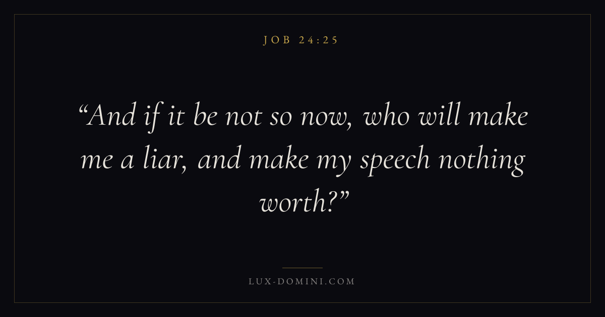 Books / Job / Chapter 24 / Verse 25 ← Job 24:24 Job 24:25 Job 25:1 → And if it be not so now, who will make me a liar, and make my speech nothing worth? Download verse card Share on Twitter Share on Facebook Pin it ✦ Key themes Suffering and trialsWisdomJustice and mercySuffering Read with Job 24:24Romans 8:182 Corinthians 4:17Proverbs 1:7 Related topics Bible verses about suffering and trialsBible verses about wisdomBible verses about justice and mercy ✦ Job Chapter 24 verses V. 1 V. 2 V. 3 V. 4 V. 5 V. 6 V. 7 V. 8 V. 9 V. 10 V. 11 V. 12 V. 13 V. 14 V. 15 V. 16 V. 17 V. 18 V. 19 V. 20 V. 21 V. 22 V. 23 V. 24 V. 25
