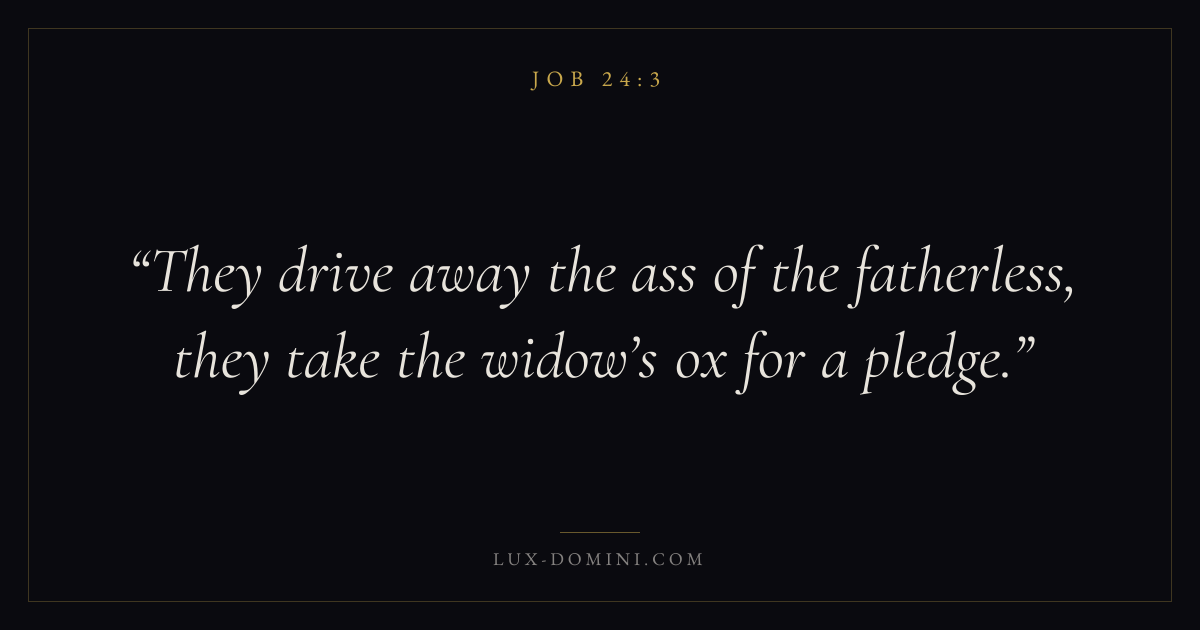 Books / Job / Chapter 24 / Verse 3 ← Job 24:2 Job 24:3 Job 24:4 → They drive away the ass of the fatherless, they take the widow’s ox for a pledge. Download verse card Share on Twitter Share on Facebook Pin it ✦ Key themes Suffering and trialsWisdomJustice and mercySuffering Read with Job 24:4Romans 8:182 Corinthians 4:17Proverbs 1:7 Related topics Bible verses about suffering and trialsBible verses about wisdomBible verses about justice and mercy ✦ Job Chapter 24 verses V. 1 V. 2 V. 3 V. 4 V. 5 V. 6 V. 7 V. 8 V. 9 V. 10 V. 11 V. 12 V. 13 V. 14 V. 15 V. 16 V. 17 V. 18 V. 19 V. 20 V. 21 V. 22 V. 23 V. 24 V. 25