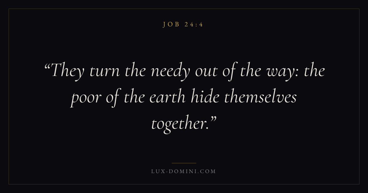 Books / Job / Chapter 24 / Verse 4 ← Job 24:3 Job 24:4 Job 24:5 → They turn the needy out of the way: the poor of the earth hide themselves together. Download verse card Share on Twitter Share on Facebook Pin it ✦ Key themes Suffering and trialsWisdomJustice and mercySuffering Read with Job 24:3Romans 8:182 Corinthians 4:17Proverbs 1:7 Related topics Bible verses about suffering and trialsBible verses about wisdomBible verses about justice and mercy ✦ Job Chapter 24 verses V. 1 V. 2 V. 3 V. 4 V. 5 V. 6 V. 7 V. 8 V. 9 V. 10 V. 11 V. 12 V. 13 V. 14 V. 15 V. 16 V. 17 V. 18 V. 19 V. 20 V. 21 V. 22 V. 23 V. 24 V. 25