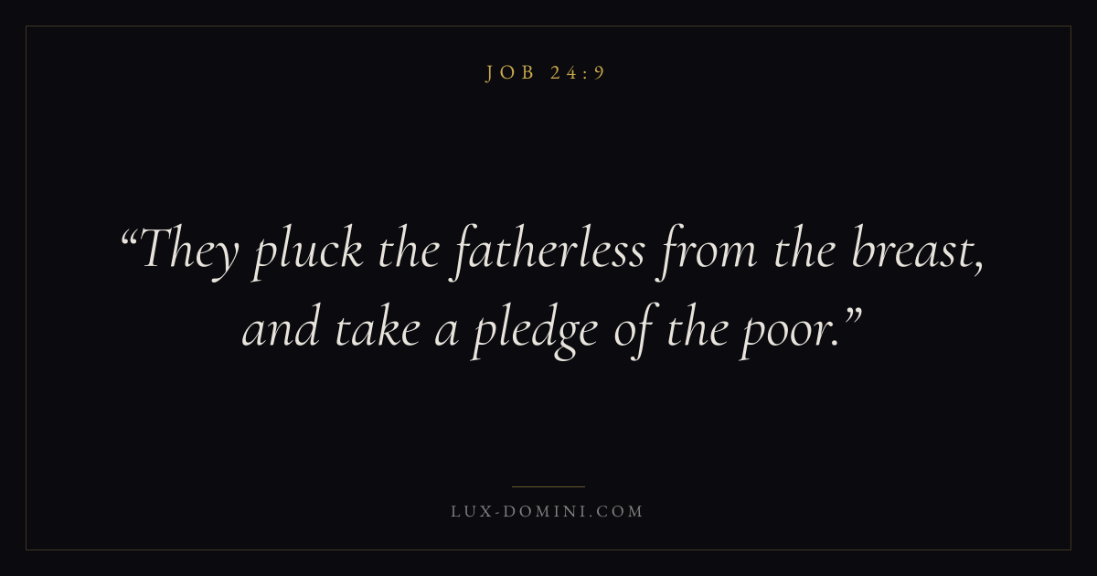 Books / Job / Chapter 24 / Verse 9 ← Job 24:8 Job 24:9 Job 24:10 → They pluck the fatherless from the breast, and take a pledge of the poor. Download verse card Share on Twitter Share on Facebook Pin it ✦ Key themes Suffering and trialsWisdomJustice and mercySuffering Read with Job 24:7Job 24:8Romans 8:182 Corinthians 4:17 Related topics Bible verses about suffering and trialsBible verses about wisdomBible verses about justice and mercy ✦ Job Chapter 24 verses V. 1 V. 2 V. 3 V. 4 V. 5 V. 6 V. 7 V. 8 V. 9 V. 10 V. 11 V. 12 V. 13 V. 14 V. 15 V. 16 V. 17 V. 18 V. 19 V. 20 V. 21 V. 22 V. 23 V. 24 V. 25