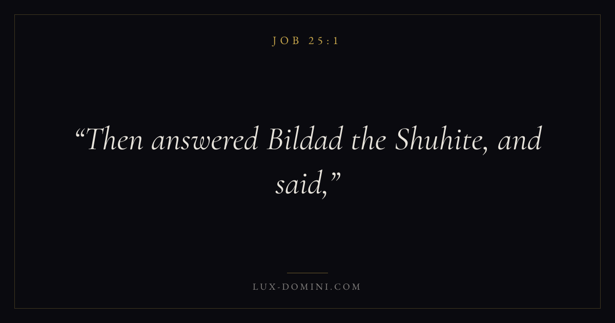 Books / Job / Chapter 25 / Verse 1 ← Job 24:25 Job 25:1 Job 25:2 → Then answered Bildad the Shuhite, and said, Download verse card Share on Twitter Share on Facebook Pin it ✦ Key themes Suffering and trialsWisdomJustice and mercySuffering Read with Job 25:2Romans 8:182 Corinthians 4:17Proverbs 1:7 Related topics Bible verses about suffering and trialsBible verses about wisdomBible verses about justice and mercy Glossary Bildad Person Son of contention, one of Job’s friends. He is called “the Shuhite,” probably as belonging to Shuah, a district in Arabia, in which Shuah, the sixth son of Abraham by Keturah, settled ( Gen. 25:2 ). ✦ Job Chapter 25 verses V. 1 V. 2 V. 3 V. 4 V. 5 V. 6
