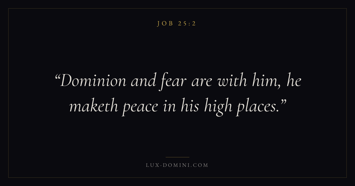 Books / Job / Chapter 25 / Verse 2 ← Job 25:1 Job 25:2 Job 25:3 → Dominion and fear are with him, he maketh peace in his high places. Download verse card Share on Twitter Share on Facebook Pin it ✦ Key themes Anxiety and fearSuffering and trialsWisdomJustice and mercySuffering Read with Job 25:1Philippians 4:6Isaiah 41:10Romans 8:18 Related topics Bible verses about anxiety and fearBible verses about suffering and trialsBible verses about wisdomBible verses about justice and mercy ✦ Job Chapter 25 verses V. 1 V. 2 V. 3 V. 4 V. 5 V. 6