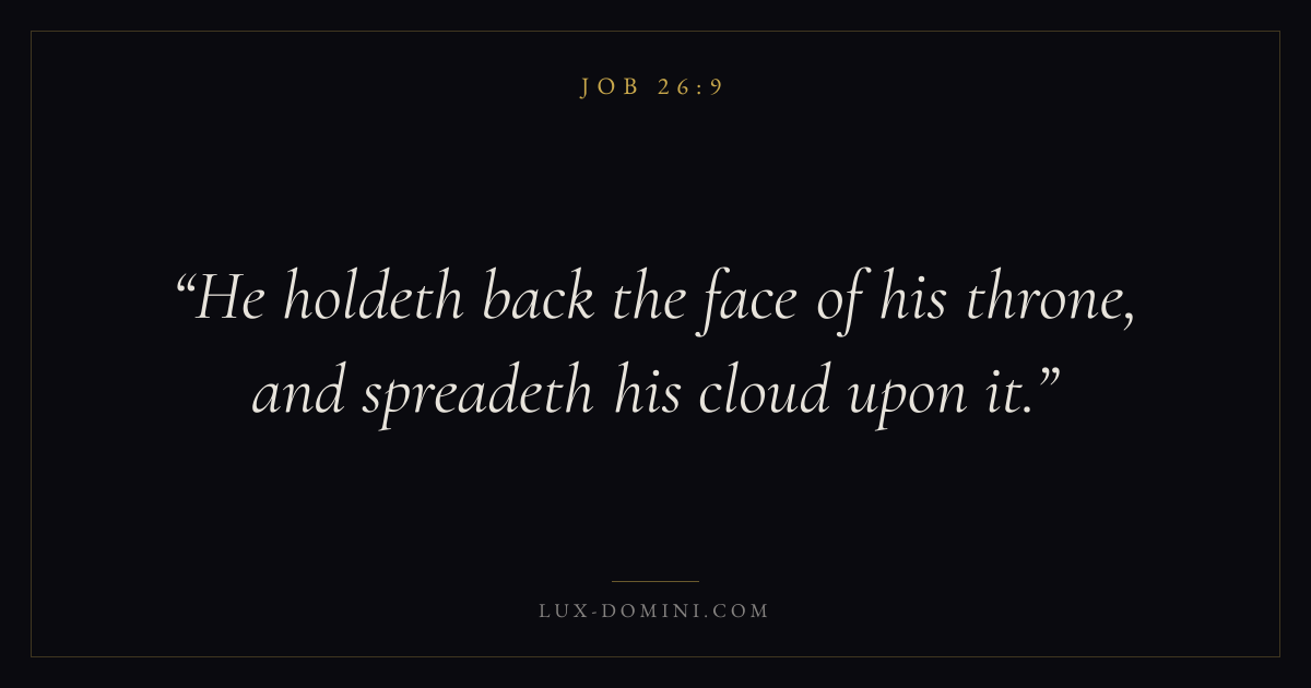 Books / Job / Chapter 26 / Verse 9 ← Job 26:8 Job 26:9 Job 26:10 → He holdeth back the face of his throne, and spreadeth his cloud upon it. Download verse card Share on Twitter Share on Facebook Pin it ✦ Key themes Suffering and trialsWisdomJustice and mercySuffering Read with Job 26:10Romans 8:182 Corinthians 4:17Proverbs 1:7 Related topics Bible verses about suffering and trialsBible verses about wisdomBible verses about justice and mercy ✦ Job Chapter 26 verses V. 1 V. 2 V. 3 V. 4 V. 5 V. 6 V. 7 V. 8 V. 9 V. 10 V. 11 V. 12 V. 13 V. 14