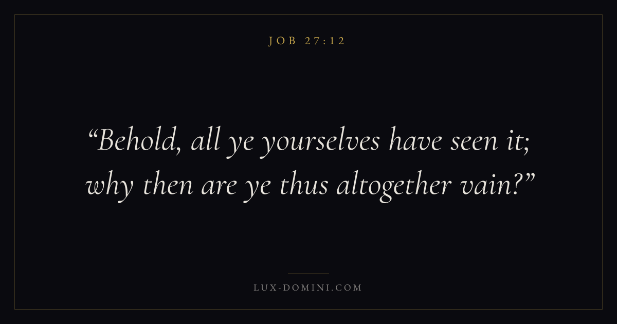 Books / Job / Chapter 27 / Verse 12 ← Job 27:11 Job 27:12 Job 27:13 → Behold, all ye yourselves have seen it; why then are ye thus altogether vain? Download verse card Share on Twitter Share on Facebook Pin it ✦ Key themes Suffering and trialsWisdomJustice and mercyPeaceSuffering Read with Job 27:11Romans 8:182 Corinthians 4:17Proverbs 1:7 Related topics Bible verses about suffering and trialsBible verses about wisdomBible verses about justice and mercyBible verses about peace ✦ Job Chapter 27 verses V. 1 V. 2 V. 3 V. 4 V. 5 V. 6 V. 7 V. 8 V. 9 V. 10 V. 11 V. 12 V. 13 V. 14 V. 15 V. 16 V. 17 V. 18 V. 19 V. 20 V. 21 V. 22 V. 23