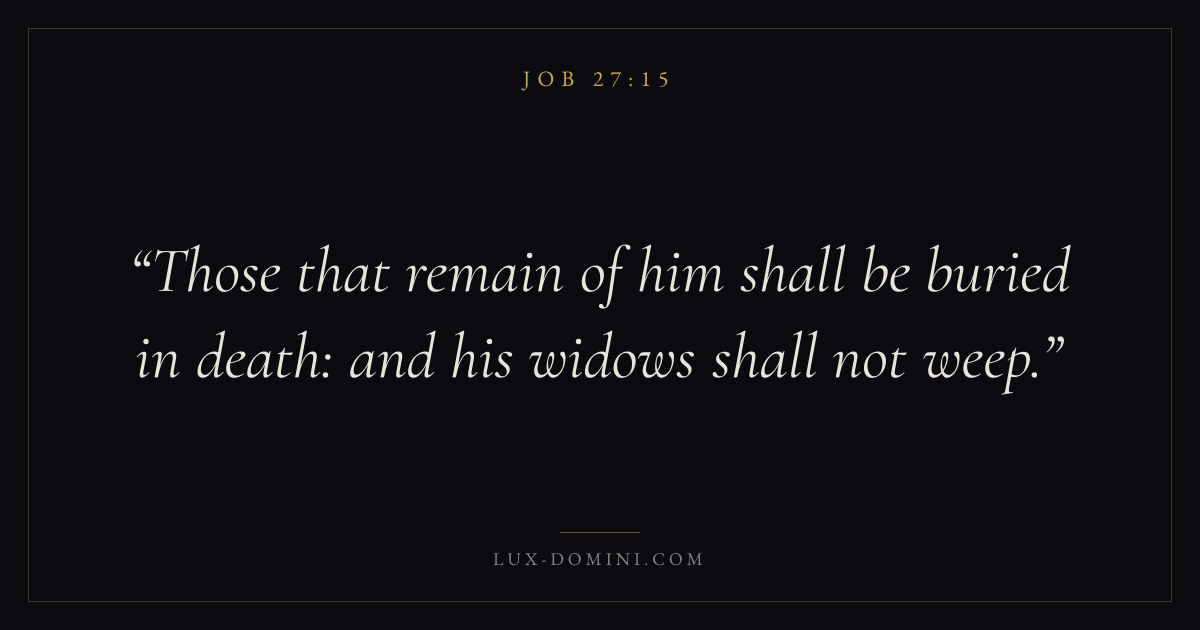 Books / Job / Chapter 27 / Verse 15 ← Job 27:14 Job 27:15 Job 27:16 → Those that remain of him shall be buried in death: and his widows shall not weep. Download verse card Share on Twitter Share on Facebook Pin it ✦ Key themes Suffering and trialsWisdomJustice and mercyPeaceSuffering Read with Job 27:13Job 27:14Romans 8:182 Corinthians 4:17 Related topics Bible verses about suffering and trialsBible verses about wisdomBible verses about justice and mercyBible verses about peace ✦ Job Chapter 27 verses V. 1 V. 2 V. 3 V. 4 V. 5 V. 6 V. 7 V. 8 V. 9 V. 10 V. 11 V. 12 V. 13 V. 14 V. 15 V. 16 V. 17 V. 18 V. 19 V. 20 V. 21 V. 22 V. 23