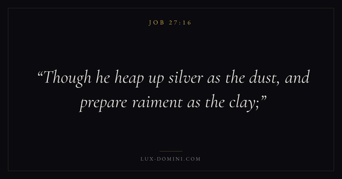 Books / Job / Chapter 27 / Verse 16 ← Job 27:15 Job 27:16 Job 27:17 → Though he heap up silver as the dust, and prepare raiment as the clay; Download verse card Share on Twitter Share on Facebook Pin it ✦ Key themes Suffering and trialsWisdomJustice and mercyPeaceSuffering Read with Job 27:17Romans 8:182 Corinthians 4:17Proverbs 1:7 Related topics Bible verses about suffering and trialsBible verses about wisdomBible verses about justice and mercyBible verses about peace ✦ Job Chapter 27 verses V. 1 V. 2 V. 3 V. 4 V. 5 V. 6 V. 7 V. 8 V. 9 V. 10 V. 11 V. 12 V. 13 V. 14 V. 15 V. 16 V. 17 V. 18 V. 19 V. 20 V. 21 V. 22 V. 23