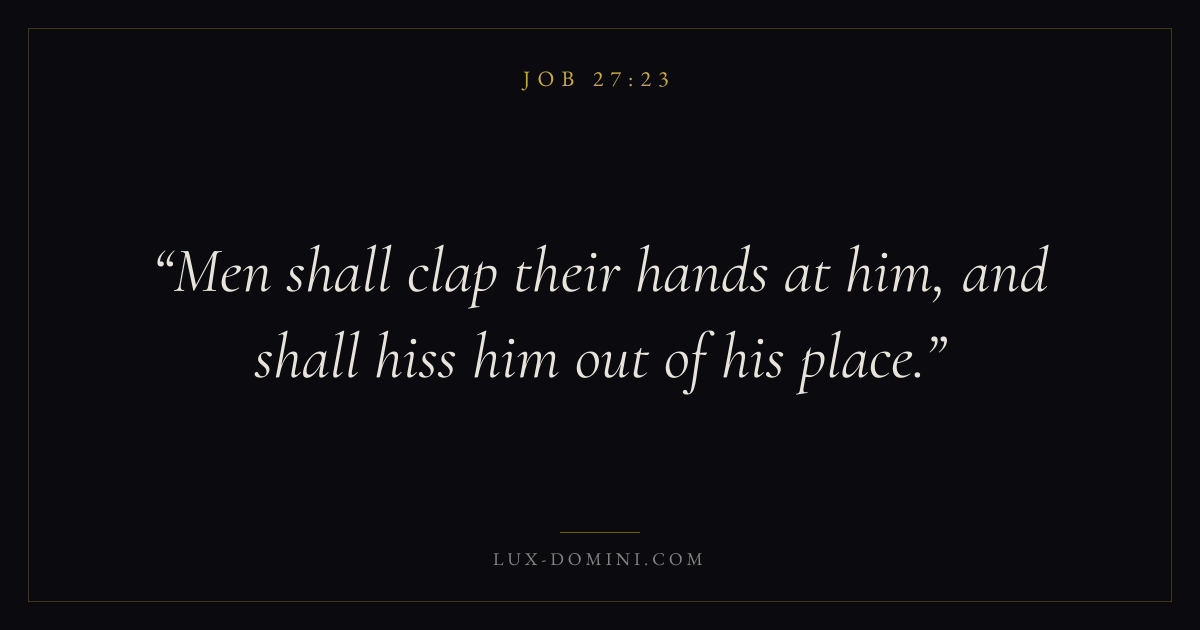 Books / Job / Chapter 27 / Verse 23 ← Job 27:22 Job 27:23 Job 28:1 → Men shall clap their hands at him, and shall hiss him out of his place. Download verse card Share on Twitter Share on Facebook Pin it ✦ Key themes Suffering and trialsWisdomJustice and mercyPeaceSuffering Read with Job 27:21Job 27:22Romans 8:182 Corinthians 4:17 Related topics Bible verses about suffering and trialsBible verses about wisdomBible verses about justice and mercyBible verses about peace ✦ Job Chapter 27 verses V. 1 V. 2 V. 3 V. 4 V. 5 V. 6 V. 7 V. 8 V. 9 V. 10 V. 11 V. 12 V. 13 V. 14 V. 15 V. 16 V. 17 V. 18 V. 19 V. 20 V. 21 V. 22 V. 23
