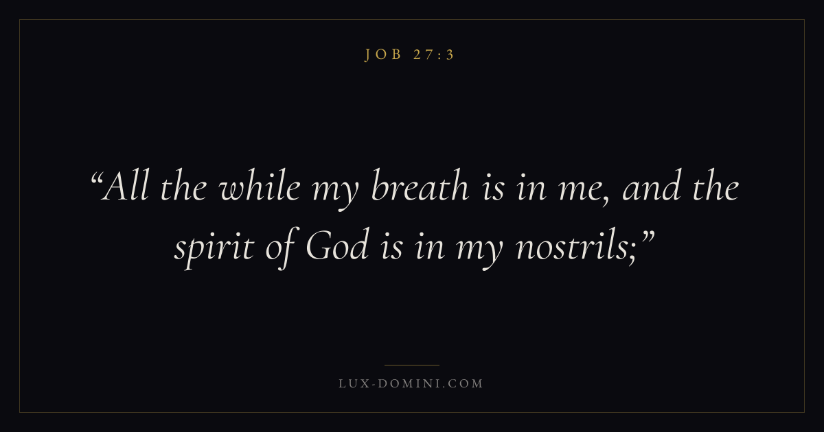 Books / Job / Chapter 27 / Verse 3 ← Job 27:2 Job 27:3 Job 27:4 → All the while my breath is in me, and the spirit of God is in my nostrils; Download verse card Share on Twitter Share on Facebook Pin it ✦ Key themes Suffering and trialsWisdomJustice and mercySuffering Read with Job 27:1Job 27:2Romans 8:182 Corinthians 4:17 Related topics Bible verses about suffering and trialsBible verses about wisdomBible verses about justice and mercy ✦ Job Chapter 27 verses V. 1 V. 2 V. 3 V. 4 V. 5 V. 6 V. 7 V. 8 V. 9 V. 10 V. 11 V. 12 V. 13 V. 14 V. 15 V. 16 V. 17 V. 18 V. 19 V. 20 V. 21 V. 22 V. 23