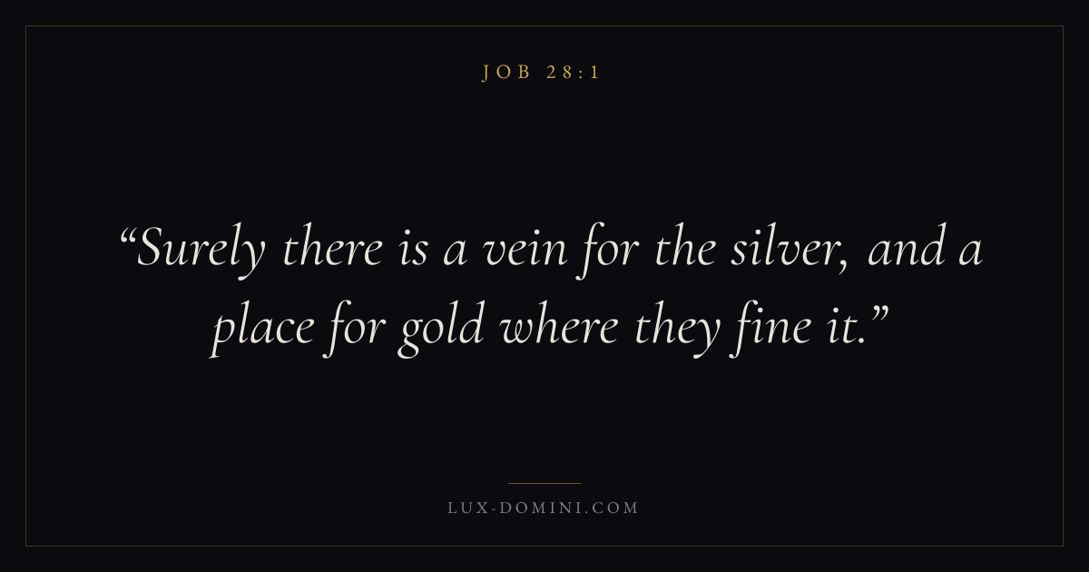 Books / Job / Chapter 28 / Verse 1 ← Job 27:23 Job 28:1 Job 28:2 → Surely there is a vein for the silver, and a place for gold where they fine it. Download verse card Share on Twitter Share on Facebook Pin it ✦ Key themes Suffering and trialsWisdomJustice and mercySuffering Read with Job 28:2Romans 8:182 Corinthians 4:17Proverbs 1:7 Related topics Bible verses about suffering and trialsBible verses about wisdomBible verses about justice and mercy ✦ Job Chapter 28 verses V. 1 V. 2 V. 3 V. 4 V. 5 V. 6 V. 7 V. 8 V. 9 V. 10 V. 11 V. 12 V. 13 V. 14 V. 15 V. 16 V. 17 V. 18 V. 19 V. 20 V. 21 V. 22 V. 23 V. 24 V. 25 V. 26 V. 27 V. 28