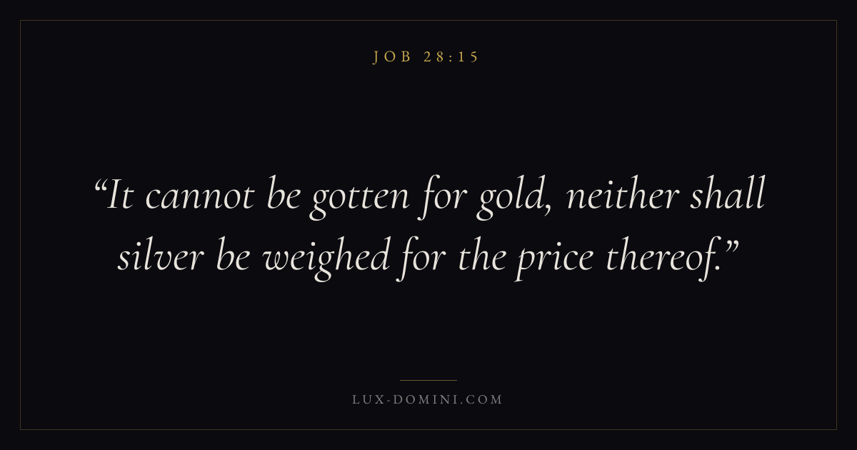 Books / Job / Chapter 28 / Verse 15 ← Job 28:14 Job 28:15 Job 28:16 → It cannot be gotten for gold, neither shall silver be weighed for the price thereof. Download verse card Share on Twitter Share on Facebook Pin it ✦ Key themes Suffering and trialsWisdomJustice and mercySuffering Read with Job 28:14Romans 8:182 Corinthians 4:17Proverbs 1:7 Related topics Bible verses about suffering and trialsBible verses about wisdomBible verses about justice and mercy ✦ Job Chapter 28 verses V. 1 V. 2 V. 3 V. 4 V. 5 V. 6 V. 7 V. 8 V. 9 V. 10 V. 11 V. 12 V. 13 V. 14 V. 15 V. 16 V. 17 V. 18 V. 19 V. 20 V. 21 V. 22 V. 23 V. 24 V. 25 V. 26 V. 27 V. 28