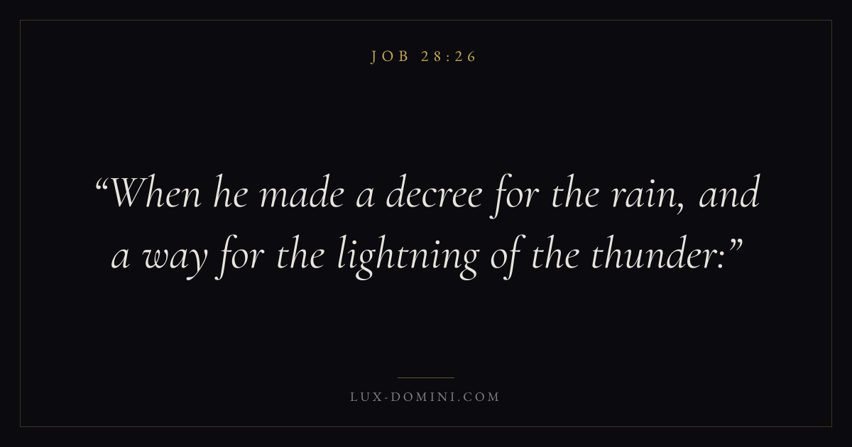 Books / Job / Chapter 28 / Verse 26 ← Job 28:25 Job 28:26 Job 28:27 → When he made a decree for the rain, and a way for the lightning of the thunder: Download verse card Share on Twitter Share on Facebook Pin it ✦ Key themes Suffering and trialsWisdomJustice and mercySuffering Read with Job 28:27Job 28:28Romans 8:182 Corinthians 4:17 Related topics Bible verses about suffering and trialsBible verses about wisdomBible verses about justice and mercy ✦ Job Chapter 28 verses V. 1 V. 2 V. 3 V. 4 V. 5 V. 6 V. 7 V. 8 V. 9 V. 10 V. 11 V. 12 V. 13 V. 14 V. 15 V. 16 V. 17 V. 18 V. 19 V. 20 V. 21 V. 22 V. 23 V. 24 V. 25 V. 26 V. 27 V. 28