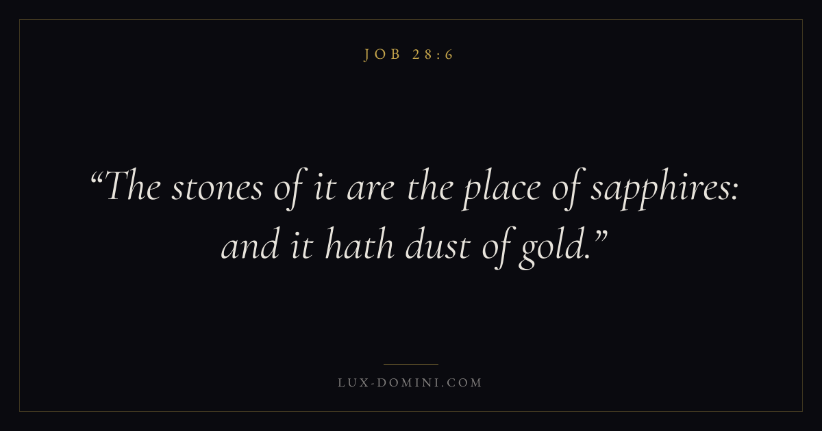 Books / Job / Chapter 28 / Verse 6 ← Job 28:5 Job 28:6 Job 28:7 → The stones of it are the place of sapphires: and it hath dust of gold. Download verse card Share on Twitter Share on Facebook Pin it ✦ Key themes Suffering and trialsWisdomJustice and mercySuffering Read with Job 28:5Romans 8:182 Corinthians 4:17Proverbs 1:7 Related topics Bible verses about suffering and trialsBible verses about wisdomBible verses about justice and mercy ✦ Job Chapter 28 verses V. 1 V. 2 V. 3 V. 4 V. 5 V. 6 V. 7 V. 8 V. 9 V. 10 V. 11 V. 12 V. 13 V. 14 V. 15 V. 16 V. 17 V. 18 V. 19 V. 20 V. 21 V. 22 V. 23 V. 24 V. 25 V. 26 V. 27 V. 28
