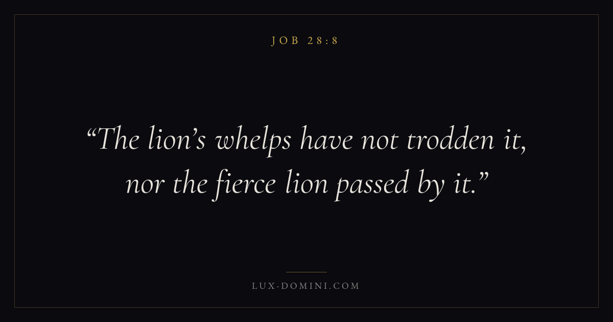 Books / Job / Chapter 28 / Verse 8 ← Job 28:7 Job 28:8 Job 28:9 → The lion’s whelps have not trodden it, nor the fierce lion passed by it. Download verse card Share on Twitter Share on Facebook Pin it ✦ Key themes Suffering and trialsWisdomJustice and mercySuffering Read with Job 28:7Romans 8:182 Corinthians 4:17Proverbs 1:7 Related topics Bible verses about suffering and trialsBible verses about wisdomBible verses about justice and mercy ✦ Job Chapter 28 verses V. 1 V. 2 V. 3 V. 4 V. 5 V. 6 V. 7 V. 8 V. 9 V. 10 V. 11 V. 12 V. 13 V. 14 V. 15 V. 16 V. 17 V. 18 V. 19 V. 20 V. 21 V. 22 V. 23 V. 24 V. 25 V. 26 V. 27 V. 28