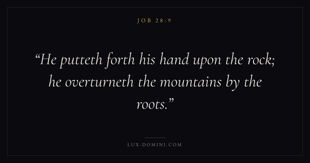 Books / Job / Chapter 28 / Verse 9 ← Job 28:8 Job 28:9 Job 28:10 → He putteth forth his hand upon the rock; he overturneth the mountains by the roots. Download verse card Share on Twitter Share on Facebook Pin it ✦ Key themes Suffering and trialsWisdomJustice and mercySuffering Read with Job 28:10Romans 8:182 Corinthians 4:17Proverbs 1:7 Related topics Bible verses about suffering and trialsBible verses about wisdomBible verses about justice and mercy ✦ Job Chapter 28 verses V. 1 V. 2 V. 3 V. 4 V. 5 V. 6 V. 7 V. 8 V. 9 V. 10 V. 11 V. 12 V. 13 V. 14 V. 15 V. 16 V. 17 V. 18 V. 19 V. 20 V. 21 V. 22 V. 23 V. 24 V. 25 V. 26 V. 27 V. 28