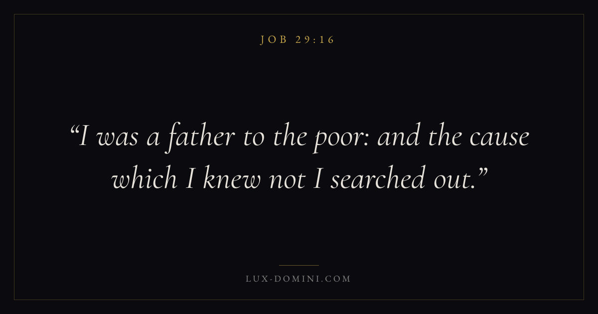 Books / Job / Chapter 29 / Verse 16 ← Job 29:15 Job 29:16 Job 29:17 → I was a father to the poor: and the cause which I knew not I searched out. Download verse card Share on Twitter Share on Facebook Pin it ✦ Key themes Suffering and trialsWisdomJustice and mercySuffering Read with Job 29:17Romans 8:182 Corinthians 4:17Proverbs 1:7 Related topics Bible verses about suffering and trialsBible verses about wisdomBible verses about justice and mercy ✦ Job Chapter 29 verses V. 1 V. 2 V. 3 V. 4 V. 5 V. 6 V. 7 V. 8 V. 9 V. 10 V. 11 V. 12 V. 13 V. 14 V. 15 V. 16 V. 17 V. 18 V. 19 V. 20 V. 21 V. 22 V. 23 V. 24 V. 25