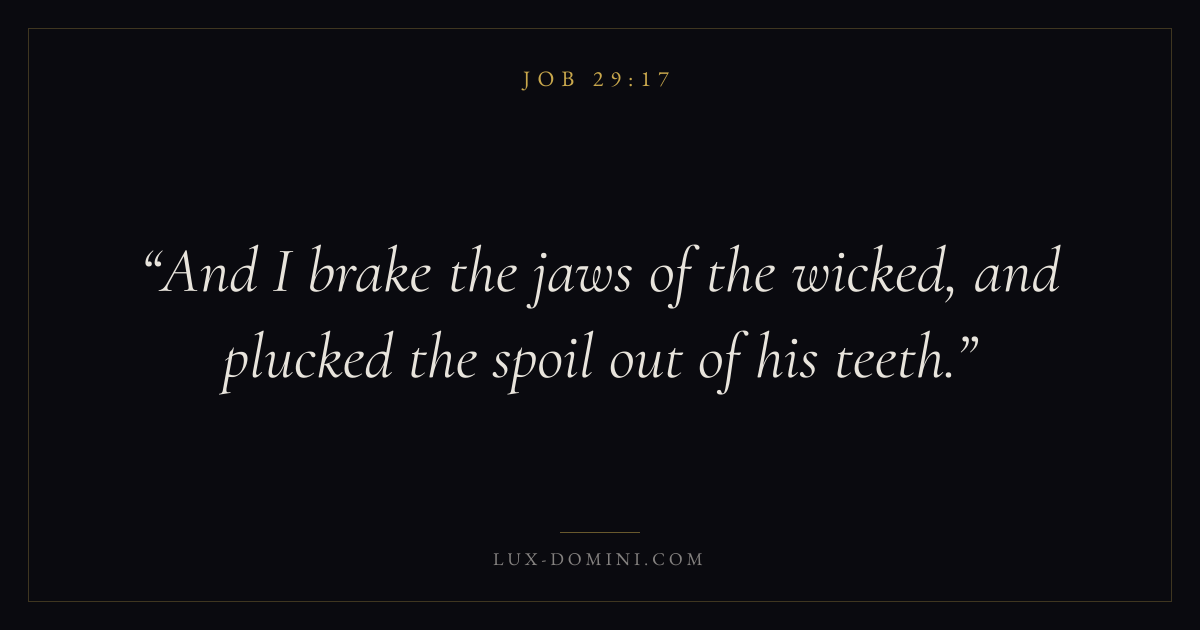 Books / Job / Chapter 29 / Verse 17 ← Job 29:16 Job 29:17 Job 29:18 → And I brake the jaws of the wicked, and plucked the spoil out of his teeth. Download verse card Share on Twitter Share on Facebook Pin it ✦ Key themes Suffering and trialsWisdomJustice and mercySuffering Read with Job 29:16Romans 8:182 Corinthians 4:17Proverbs 1:7 Related topics Bible verses about suffering and trialsBible verses about wisdomBible verses about justice and mercy ✦ Job Chapter 29 verses V. 1 V. 2 V. 3 V. 4 V. 5 V. 6 V. 7 V. 8 V. 9 V. 10 V. 11 V. 12 V. 13 V. 14 V. 15 V. 16 V. 17 V. 18 V. 19 V. 20 V. 21 V. 22 V. 23 V. 24 V. 25