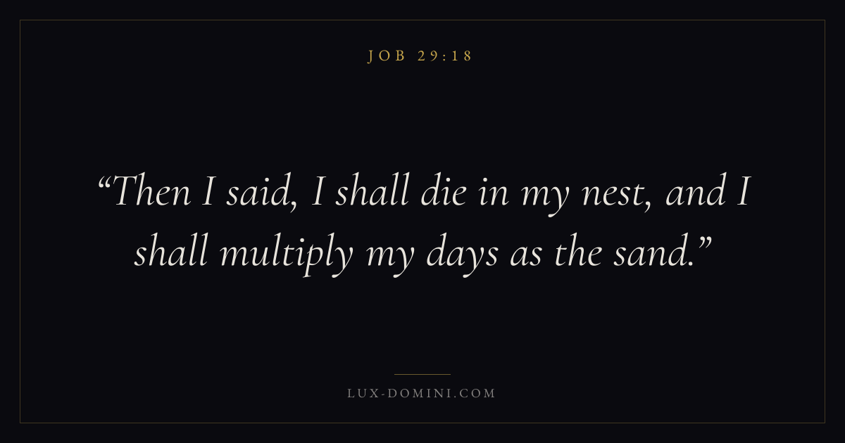 Books / Job / Chapter 29 / Verse 18 ← Job 29:17 Job 29:18 Job 29:19 → Then I said, I shall die in my nest, and I shall multiply my days as the sand. Download verse card Share on Twitter Share on Facebook Pin it ✦ Key themes FaithHopeSuffering and trialsWisdomSuffering Read with Job 29:19Hebrews 11:1Romans 10:17Romans 8:24 Related topics Bible verses about faithBible verses about hopeBible verses about suffering and trialsBible verses about wisdom ✦ Job Chapter 29 verses V. 1 V. 2 V. 3 V. 4 V. 5 V. 6 V. 7 V. 8 V. 9 V. 10 V. 11 V. 12 V. 13 V. 14 V. 15 V. 16 V. 17 V. 18 V. 19 V. 20 V. 21 V. 22 V. 23 V. 24 V. 25