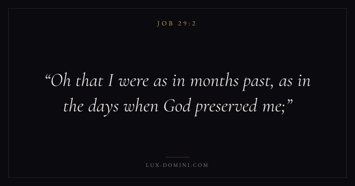 Books / Job / Chapter 29 / Verse 2 ← Job 29:1 Job 29:2 Job 29:3 → Oh that I were as in months past, as in the days when God preserved me; Download verse card Share on Twitter Share on Facebook Pin it ✦ Key themes Suffering and trialsWisdomJustice and mercyGraceSuffering Read with Job 29:1Job 29:3Romans 8:182 Corinthians 4:17 Related topics Bible verses about suffering and trialsBible verses about wisdomBible verses about justice and mercyBible verses about grace ✦ Job Chapter 29 verses V. 1 V. 2 V. 3 V. 4 V. 5 V. 6 V. 7 V. 8 V. 9 V. 10 V. 11 V. 12 V. 13 V. 14 V. 15 V. 16 V. 17 V. 18 V. 19 V. 20 V. 21 V. 22 V. 23 V. 24 V. 25