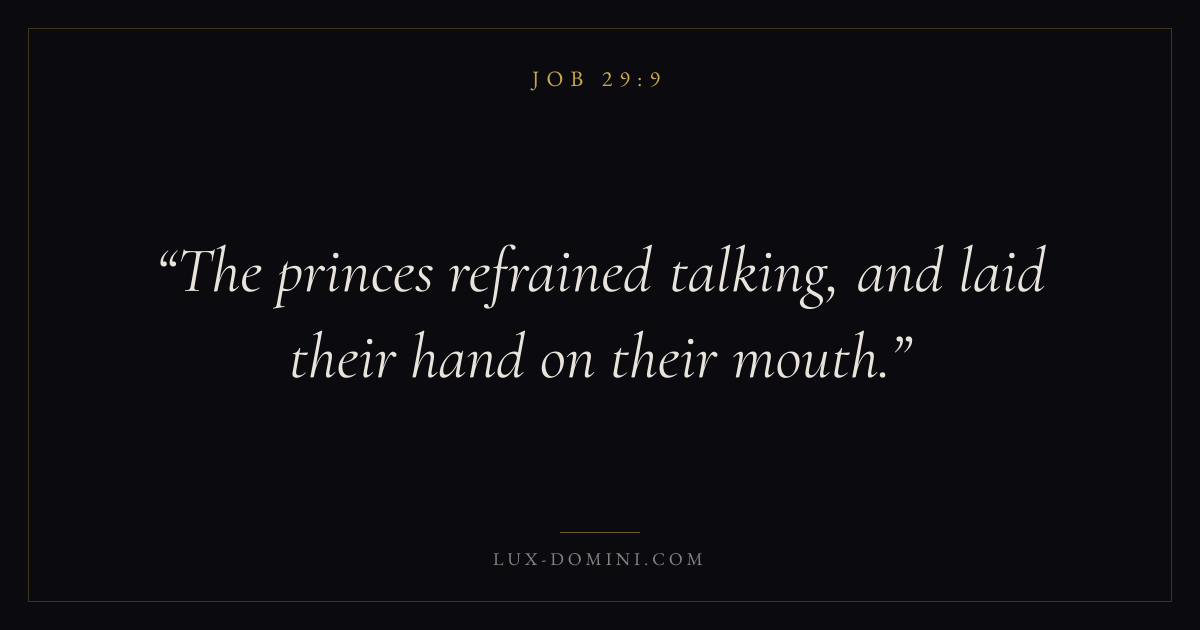 Books / Job / Chapter 29 / Verse 9 ← Job 29:8 Job 29:9 Job 29:10 → The princes refrained talking, and laid their hand on their mouth. Download verse card Share on Twitter Share on Facebook Pin it ✦ Key themes Suffering and trialsWisdomJustice and mercySuffering Read with Job 29:10Romans 8:182 Corinthians 4:17Proverbs 1:7 Related topics Bible verses about suffering and trialsBible verses about wisdomBible verses about justice and mercy ✦ Job Chapter 29 verses V. 1 V. 2 V. 3 V. 4 V. 5 V. 6 V. 7 V. 8 V. 9 V. 10 V. 11 V. 12 V. 13 V. 14 V. 15 V. 16 V. 17 V. 18 V. 19 V. 20 V. 21 V. 22 V. 23 V. 24 V. 25