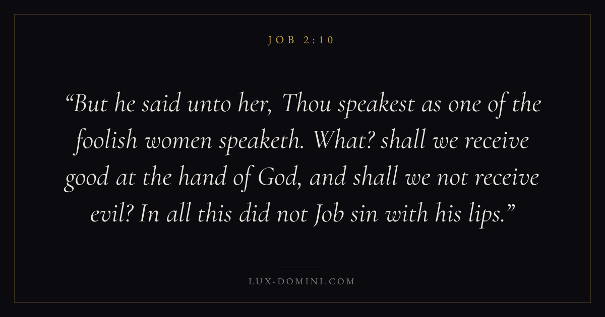 But he said unto her, Thou speakest as one of the foolish women speaketh. What? shall we receive good at the hand of God, and shall we not receive evil? In all this did not Job sin with his lips.