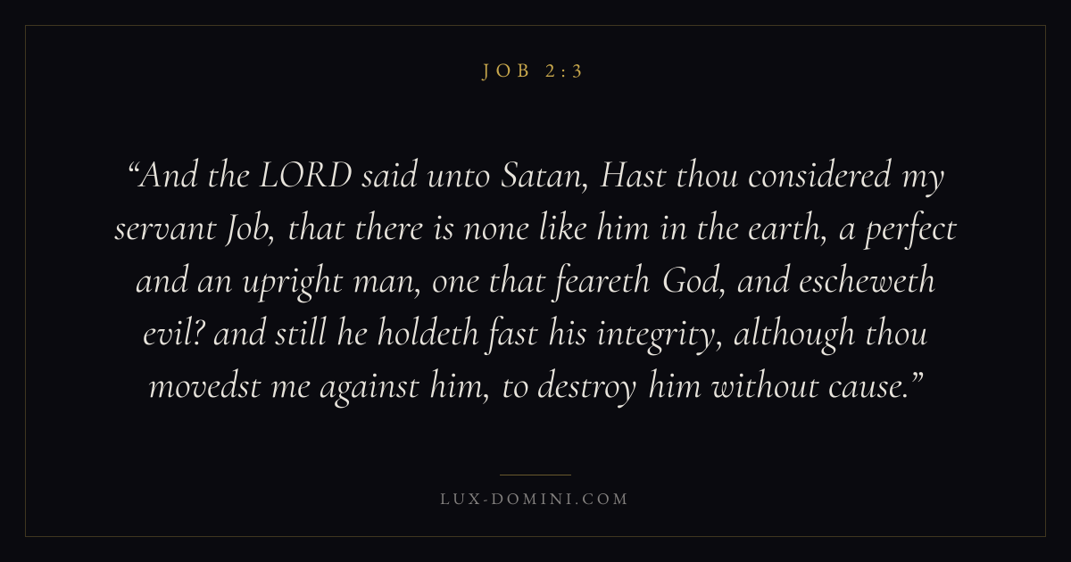 And the LORD said unto Satan, Hast thou considered my servant Job, that there is none like him in the earth, a perfect and an upright man, one that feareth God, and escheweth evil? and still he holdeth fast his integrity, although thou movedst me against him, to destroy him without cause.