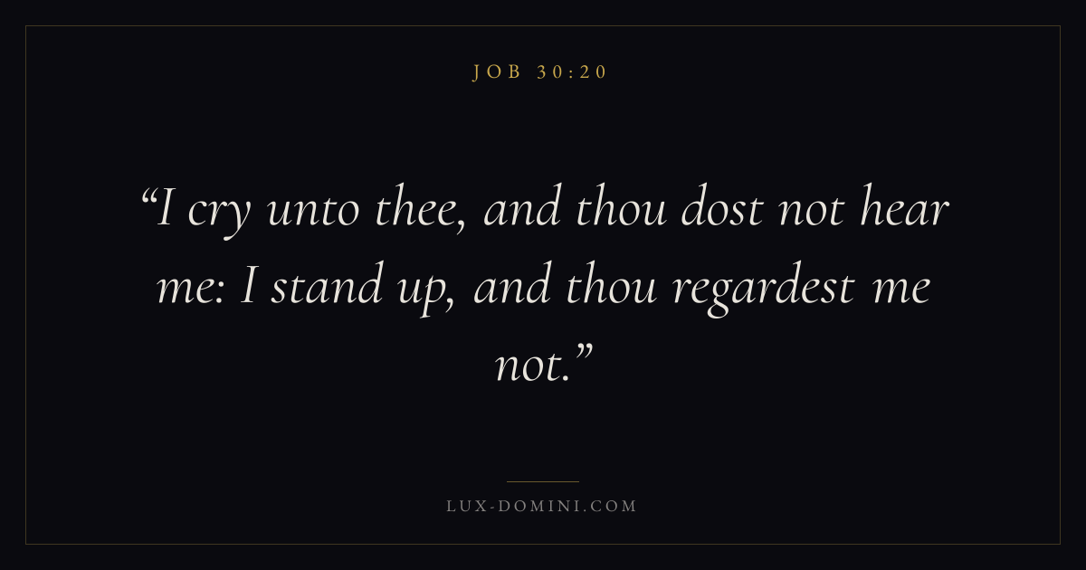 Books / Job / Chapter 30 / Verse 20 ← Job 30:19 Job 30:20 Job 30:21 → I cry unto thee, and thou dost not hear me: I stand up, and thou regardest me not. Download verse card Share on Twitter Share on Facebook Pin it ✦ Key themes Suffering and trialsWisdomJustice and mercySuffering Read with Job 30:19Job 30:21Romans 8:182 Corinthians 4:17 Related topics Bible verses about suffering and trialsBible verses about wisdomBible verses about justice and mercy ✦ Job Chapter 30 verses V. 1 V. 2 V. 3 V. 4 V. 5 V. 6 V. 7 V. 8 V. 9 V. 10 V. 11 V. 12 V. 13 V. 14 V. 15 V. 16 V. 17 V. 18 V. 19 V. 20 V. 21 V. 22 V. 23 V. 24 V. 25 V. 26 V. 27 V. 28 V. 29 V. 30 V. 31
