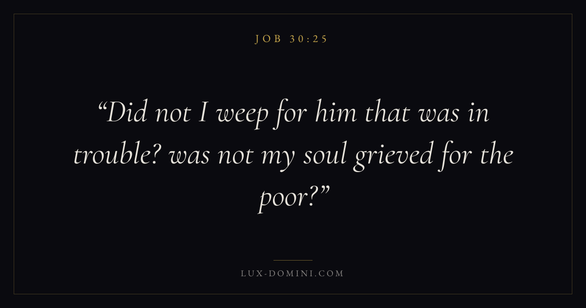Books / Job / Chapter 30 / Verse 25 ← Job 30:24 Job 30:25 Job 30:26 → Did not I weep for him that was in trouble? was not my soul grieved for the poor? Download verse card Share on Twitter Share on Facebook Pin it ✦ Key themes Suffering and trialsWisdomJustice and mercySuffering Read with Job 30:24Romans 8:182 Corinthians 4:17Proverbs 1:7 Related topics Bible verses about suffering and trialsBible verses about wisdomBible verses about justice and mercy ✦ Job Chapter 30 verses V. 1 V. 2 V. 3 V. 4 V. 5 V. 6 V. 7 V. 8 V. 9 V. 10 V. 11 V. 12 V. 13 V. 14 V. 15 V. 16 V. 17 V. 18 V. 19 V. 20 V. 21 V. 22 V. 23 V. 24 V. 25 V. 26 V. 27 V. 28 V. 29 V. 30 V. 31