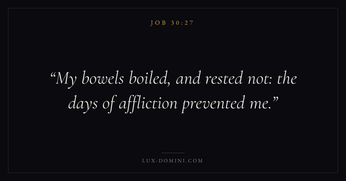 Books / Job / Chapter 30 / Verse 27 ← Job 30:26 Job 30:27 Job 30:28 → My bowels boiled, and rested not: the days of affliction prevented me. Download verse card Share on Twitter Share on Facebook Pin it ✦ Key themes Suffering and trialsWisdomJustice and mercySuffering Read with Job 30:26Romans 8:182 Corinthians 4:17Proverbs 1:7 Related topics Bible verses about suffering and trialsBible verses about wisdomBible verses about justice and mercy ✦ Job Chapter 30 verses V. 1 V. 2 V. 3 V. 4 V. 5 V. 6 V. 7 V. 8 V. 9 V. 10 V. 11 V. 12 V. 13 V. 14 V. 15 V. 16 V. 17 V. 18 V. 19 V. 20 V. 21 V. 22 V. 23 V. 24 V. 25 V. 26 V. 27 V. 28 V. 29 V. 30 V. 31