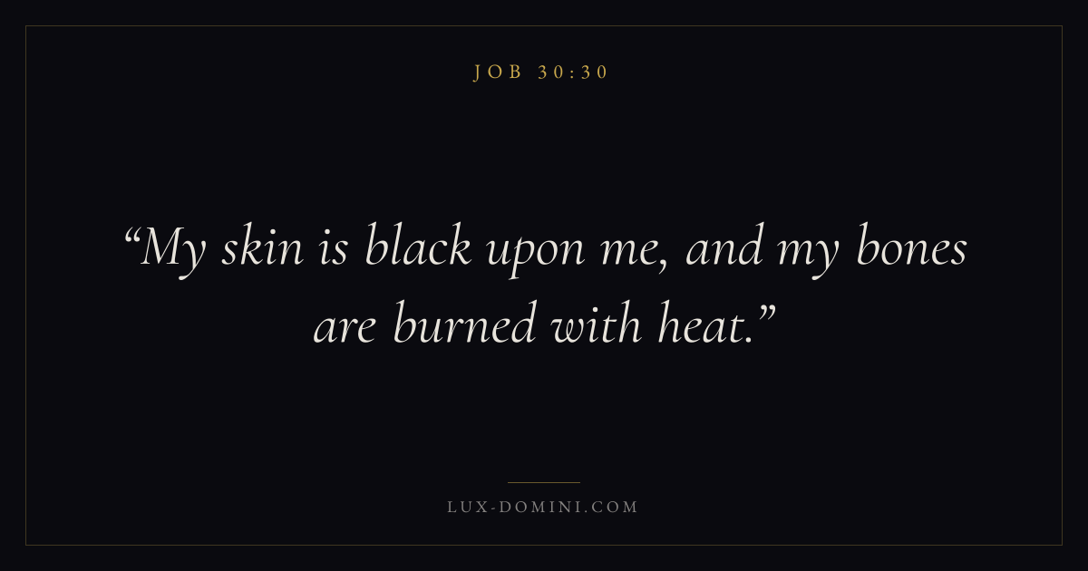 Books / Job / Chapter 30 / Verse 30 ← Job 30:29 Job 30:30 Job 30:31 → My skin is black upon me, and my bones are burned with heat. Download verse card Share on Twitter Share on Facebook Pin it ✦ Key themes Suffering and trialsWisdomJustice and mercySuffering Read with Job 30:31Romans 8:182 Corinthians 4:17Proverbs 1:7 Related topics Bible verses about suffering and trialsBible verses about wisdomBible verses about justice and mercy ✦ Job Chapter 30 verses V. 1 V. 2 V. 3 V. 4 V. 5 V. 6 V. 7 V. 8 V. 9 V. 10 V. 11 V. 12 V. 13 V. 14 V. 15 V. 16 V. 17 V. 18 V. 19 V. 20 V. 21 V. 22 V. 23 V. 24 V. 25 V. 26 V. 27 V. 28 V. 29 V. 30 V. 31