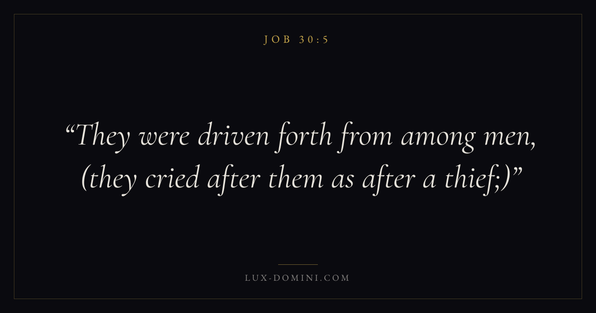 Books / Job / Chapter 30 / Verse 5 ← Job 30:4 Job 30:5 Job 30:6 → They were driven forth from among men, (they cried after them as after a thief;) Download verse card Share on Twitter Share on Facebook Pin it ✦ Key themes Suffering and trialsWisdomJustice and mercyHumilitySuffering Read with Job 30:4Job 30:6Romans 8:182 Corinthians 4:17 Related topics Bible verses about suffering and trialsBible verses about wisdomBible verses about justice and mercyBible verses about humility ✦ Job Chapter 30 verses V. 1 V. 2 V. 3 V. 4 V. 5 V. 6 V. 7 V. 8 V. 9 V. 10 V. 11 V. 12 V. 13 V. 14 V. 15 V. 16 V. 17 V. 18 V. 19 V. 20 V. 21 V. 22 V. 23 V. 24 V. 25 V. 26 V. 27 V. 28 V. 29 V. 30 V. 31