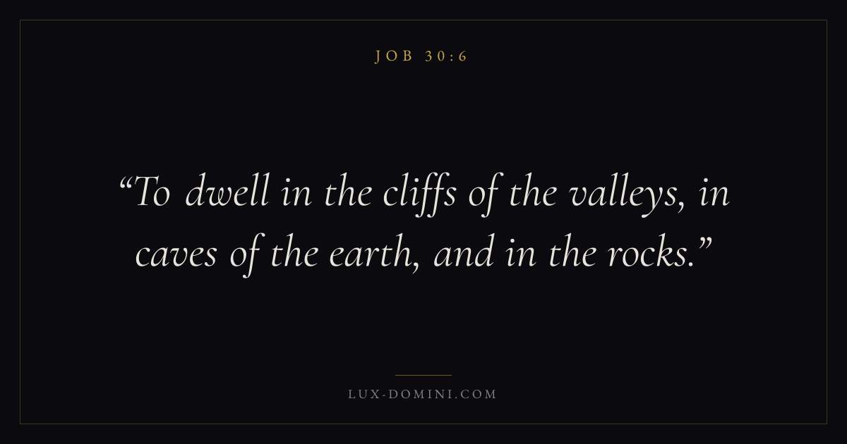 Books / Job / Chapter 30 / Verse 6 ← Job 30:5 Job 30:6 Job 30:7 → To dwell in the cliffs of the valleys, in caves of the earth, and in the rocks. Download verse card Share on Twitter Share on Facebook Pin it ✦ Key themes Suffering and trialsWisdomJustice and mercyHumilitySuffering Read with Job 30:4Job 30:5Romans 8:182 Corinthians 4:17 Related topics Bible verses about suffering and trialsBible verses about wisdomBible verses about justice and mercyBible verses about humility ✦ Job Chapter 30 verses V. 1 V. 2 V. 3 V. 4 V. 5 V. 6 V. 7 V. 8 V. 9 V. 10 V. 11 V. 12 V. 13 V. 14 V. 15 V. 16 V. 17 V. 18 V. 19 V. 20 V. 21 V. 22 V. 23 V. 24 V. 25 V. 26 V. 27 V. 28 V. 29 V. 30 V. 31