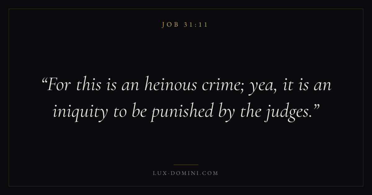 Books / Job / Chapter 31 / Verse 11 ← Job 31:10 Job 31:11 Job 31:12 → For this is an heinous crime; yea, it is an iniquity to be punished by the judges. Download verse card Share on Twitter Share on Facebook Pin it ✦ Key themes Suffering and trialsWisdomJustice and mercySuffering Read with Job 31:9Job 31:10Romans 8:182 Corinthians 4:17 Related topics Bible verses about suffering and trialsBible verses about wisdomBible verses about justice and mercy ✦ Job Chapter 31 verses V. 1 V. 2 V. 3 V. 4 V. 5 V. 6 V. 7 V. 8 V. 9 V. 10 V. 11 V. 12 V. 13 V. 14 V. 15 V. 16 V. 17 V. 18 V. 19 V. 20 V. 21 V. 22 V. 23 V. 24 V. 25 V. 26 V. 27 V. 28 V. 29 V. 30 V. 31 V. 32 V. 33 V. 34 V. 35 V. 36 V. 37 V. 38 V. 39 V. 40