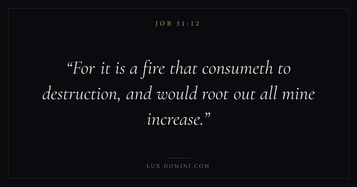 Books / Job / Chapter 31 / Verse 12 ← Job 31:11 Job 31:12 Job 31:13 → For it is a fire that consumeth to destruction, and would root out all mine increase. Download verse card Share on Twitter Share on Facebook Pin it ✦ Key themes Suffering and trialsWisdomJustice and mercySuffering Read with Job 31:9Job 31:10Romans 8:182 Corinthians 4:17 Related topics Bible verses about suffering and trialsBible verses about wisdomBible verses about justice and mercy ✦ Job Chapter 31 verses V. 1 V. 2 V. 3 V. 4 V. 5 V. 6 V. 7 V. 8 V. 9 V. 10 V. 11 V. 12 V. 13 V. 14 V. 15 V. 16 V. 17 V. 18 V. 19 V. 20 V. 21 V. 22 V. 23 V. 24 V. 25 V. 26 V. 27 V. 28 V. 29 V. 30 V. 31 V. 32 V. 33 V. 34 V. 35 V. 36 V. 37 V. 38 V. 39 V. 40