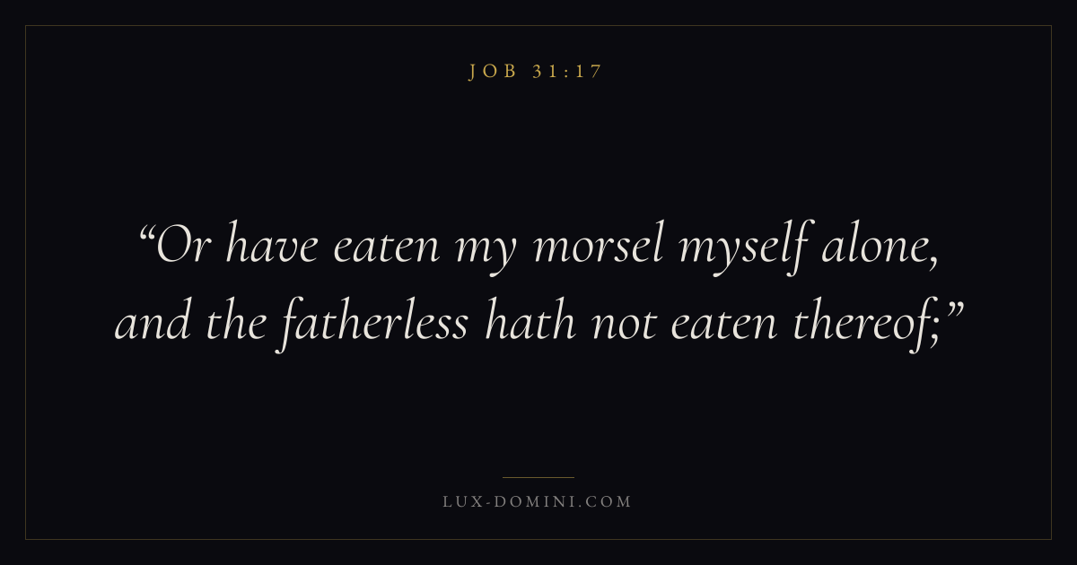 Books / Job / Chapter 31 / Verse 17 ← Job 31:16 Job 31:17 Job 31:18 → Or have eaten my morsel myself alone, and the fatherless hath not eaten thereof; Download verse card Share on Twitter Share on Facebook Pin it ✦ Key themes Suffering and trialsWisdomJustice and mercyTruthSuffering Read with Job 31:16Job 31:18Romans 8:182 Corinthians 4:17 Related topics Bible verses about suffering and trialsBible verses about wisdomBible verses about justice and mercyBible verses about truth ✦ Job Chapter 31 verses V. 1 V. 2 V. 3 V. 4 V. 5 V. 6 V. 7 V. 8 V. 9 V. 10 V. 11 V. 12 V. 13 V. 14 V. 15 V. 16 V. 17 V. 18 V. 19 V. 20 V. 21 V. 22 V. 23 V. 24 V. 25 V. 26 V. 27 V. 28 V. 29 V. 30 V. 31 V. 32 V. 33 V. 34 V. 35 V. 36 V. 37 V. 38 V. 39 V. 40