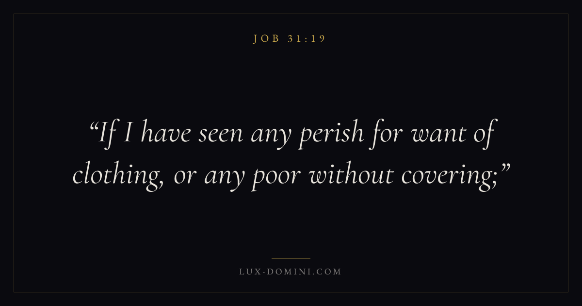 Books / Job / Chapter 31 / Verse 19 ← Job 31:18 Job 31:19 Job 31:20 → If I have seen any perish for want of clothing, or any poor without covering; Download verse card Share on Twitter Share on Facebook Pin it ✦ Key themes Suffering and trialsWisdomJustice and mercyTruthSuffering Read with Job 31:16Job 31:17Romans 8:182 Corinthians 4:17 Related topics Bible verses about suffering and trialsBible verses about wisdomBible verses about justice and mercyBible verses about truth ✦ Job Chapter 31 verses V. 1 V. 2 V. 3 V. 4 V. 5 V. 6 V. 7 V. 8 V. 9 V. 10 V. 11 V. 12 V. 13 V. 14 V. 15 V. 16 V. 17 V. 18 V. 19 V. 20 V. 21 V. 22 V. 23 V. 24 V. 25 V. 26 V. 27 V. 28 V. 29 V. 30 V. 31 V. 32 V. 33 V. 34 V. 35 V. 36 V. 37 V. 38 V. 39 V. 40