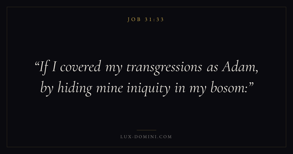 Books / Job / Chapter 31 / Verse 33 ← Job 31:32 Job 31:33 Job 31:34 → If I covered my transgressions as Adam, by hiding mine iniquity in my bosom: Download verse card Share on Twitter Share on Facebook Pin it ✦ Key themes Suffering and trialsWisdomJustice and mercySuffering Read with Job 31:34Romans 8:182 Corinthians 4:17Proverbs 1:7 Related topics Bible verses about suffering and trialsBible verses about wisdomBible verses about justice and mercy ✦ Job Chapter 31 verses V. 1 V. 2 V. 3 V. 4 V. 5 V. 6 V. 7 V. 8 V. 9 V. 10 V. 11 V. 12 V. 13 V. 14 V. 15 V. 16 V. 17 V. 18 V. 19 V. 20 V. 21 V. 22 V. 23 V. 24 V. 25 V. 26 V. 27 V. 28 V. 29 V. 30 V. 31 V. 32 V. 33 V. 34 V. 35 V. 36 V. 37 V. 38 V. 39 V. 40
