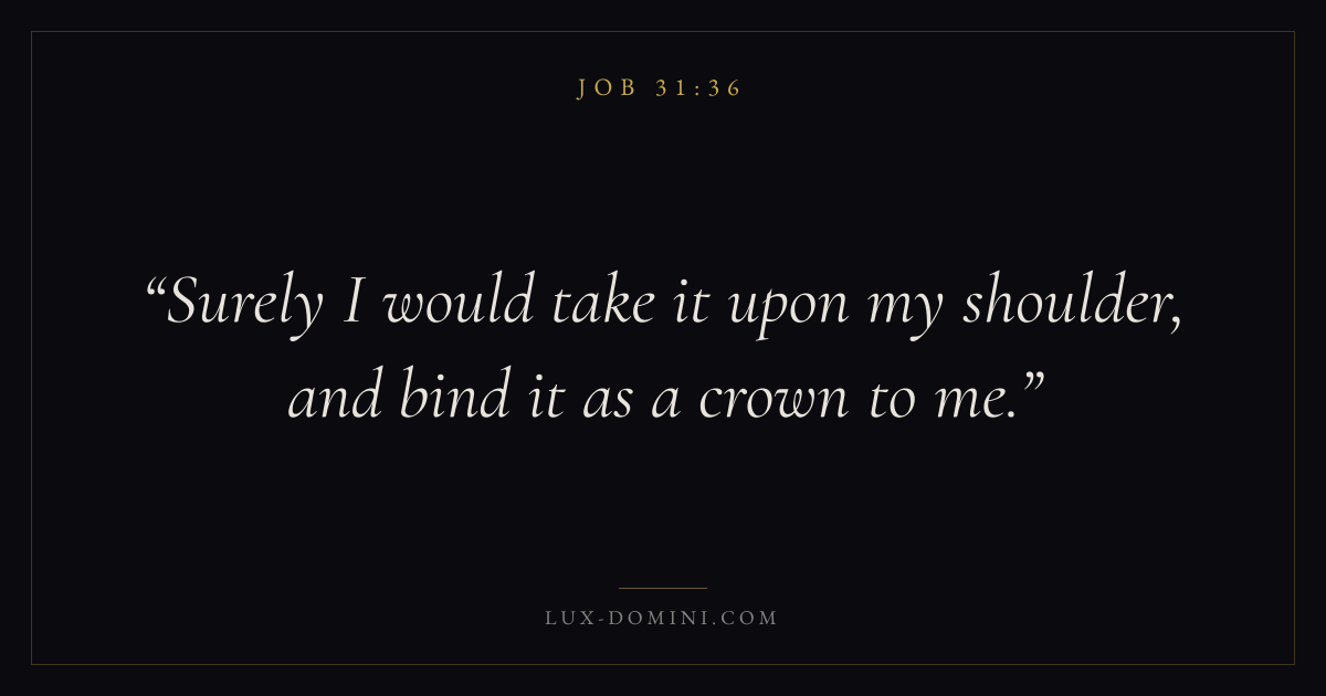 Books / Job / Chapter 31 / Verse 36 ← Job 31:35 Job 31:36 Job 31:37 → Surely I would take it upon my shoulder, and bind it as a crown to me. Download verse card Share on Twitter Share on Facebook Pin it ✦ Key themes Suffering and trialsWisdomJustice and mercySuffering Read with Job 31:35Job 31:37Romans 8:182 Corinthians 4:17 Related topics Bible verses about suffering and trialsBible verses about wisdomBible verses about justice and mercy ✦ Job Chapter 31 verses V. 1 V. 2 V. 3 V. 4 V. 5 V. 6 V. 7 V. 8 V. 9 V. 10 V. 11 V. 12 V. 13 V. 14 V. 15 V. 16 V. 17 V. 18 V. 19 V. 20 V. 21 V. 22 V. 23 V. 24 V. 25 V. 26 V. 27 V. 28 V. 29 V. 30 V. 31 V. 32 V. 33 V. 34 V. 35 V. 36 V. 37 V. 38 V. 39 V. 40